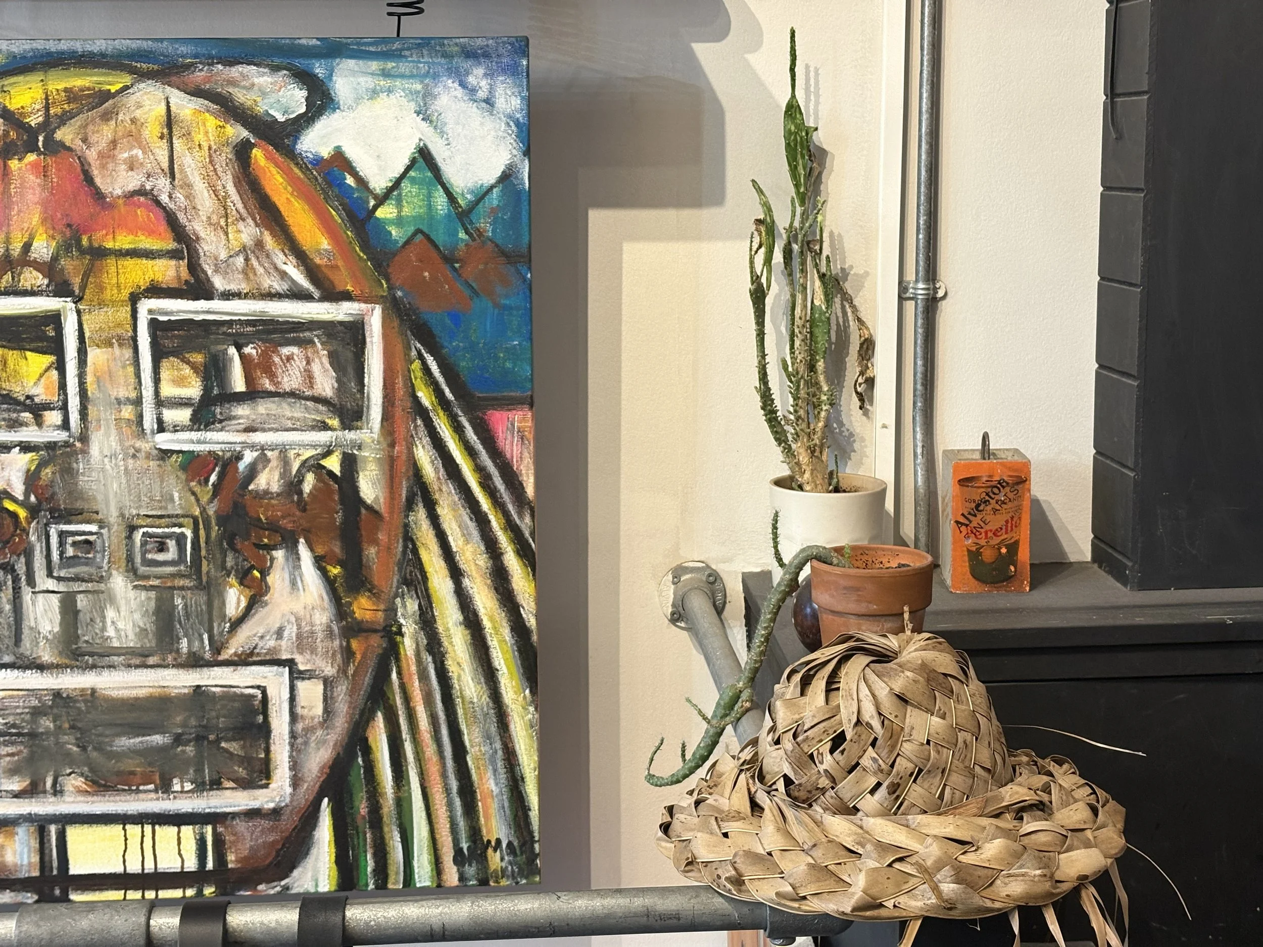 Colourful artwork is placed strategically around an assortment of utilitarian-style clothing — leather jackets, hats, and bags. I observed the process in action as Marc thoughtfully reorganised and curated his pieces around the store. The entirety of the space felt like a moving piece of art, everything sifting together with purpose and intention.